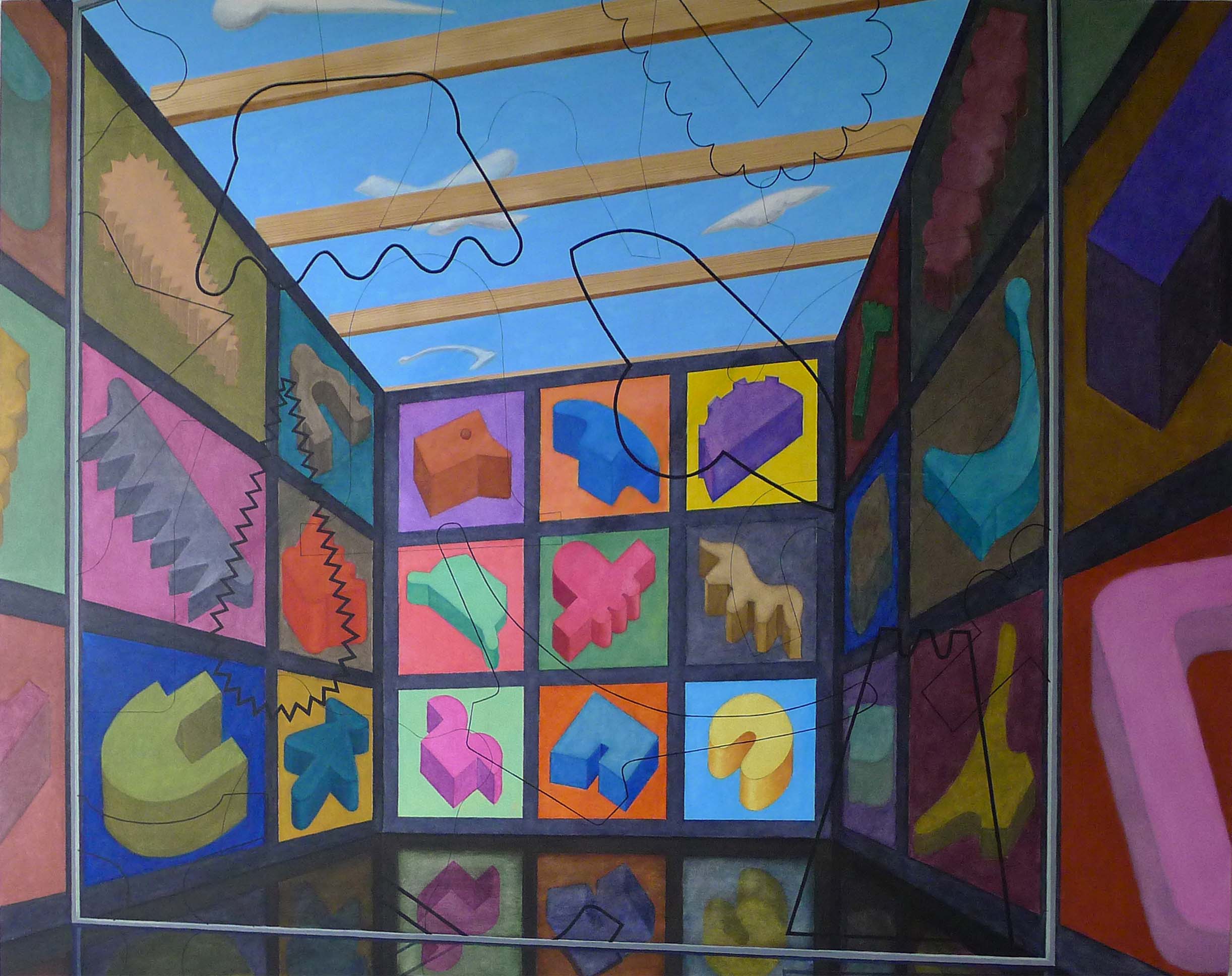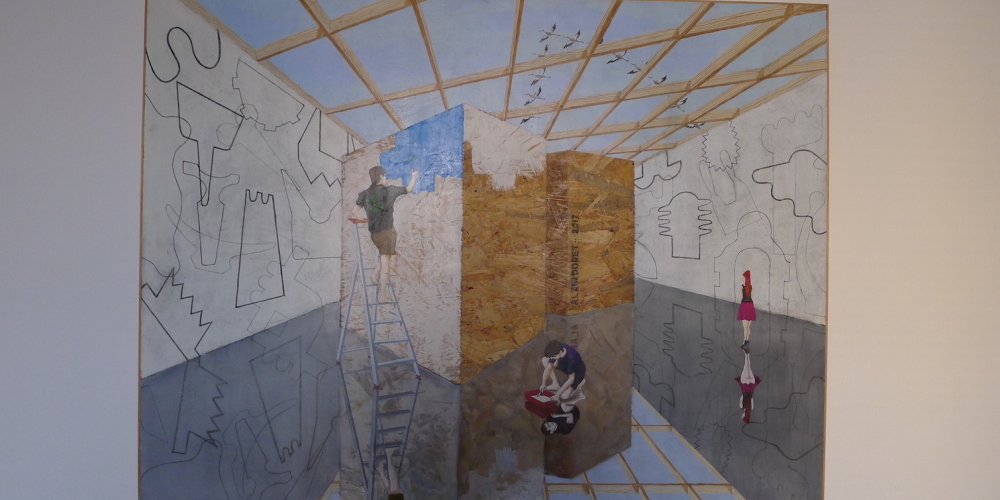 J’ai eu l’idée de créer un espace dans lequel j’avais une exposition à monter. Un espace où je n’avais pas de contraintes budgétaires, mais seulement d’espaces. J’avais carte blanche, je pouvais avoir des assistants, du matériel, des outils, etc. Lors de mes expositions, j’ai été confronté à différents espaces, je me suis souvenu d’un lieu en particulier qui était scindé par un mur de verre. J’ai décidé de le reconstruire pour faire le Dessin Mural N°4, soutenu par une structure que l’on retrouve souvent dans les grandes surfaces. Ce style de plafond m’intéresse, car il ouvre, aère l’espace architectural. C’est ainsi que j’ai pu créer trois espaces, le premier pourrait représenter le moyen-age, le deuxième, le modernisme, le troisième, le futur. Ce qui m’a amené à donner comme titre 14 pour le XIV siècles et 21 pour le XXI siècles deux chiffres qui m’ont rappelé un jeu de société ».
